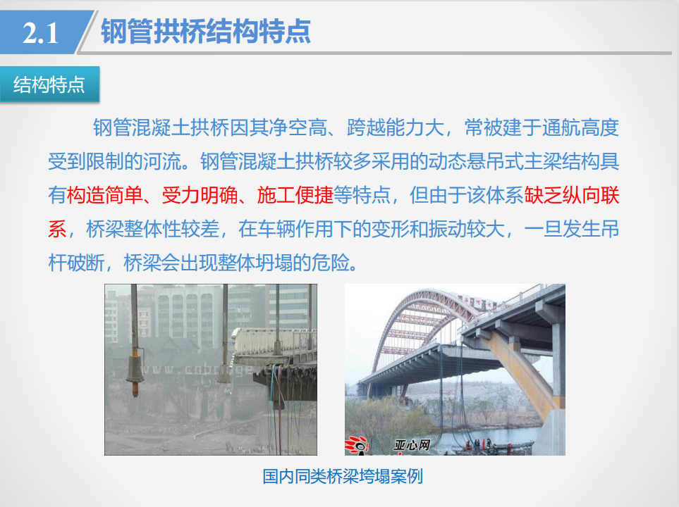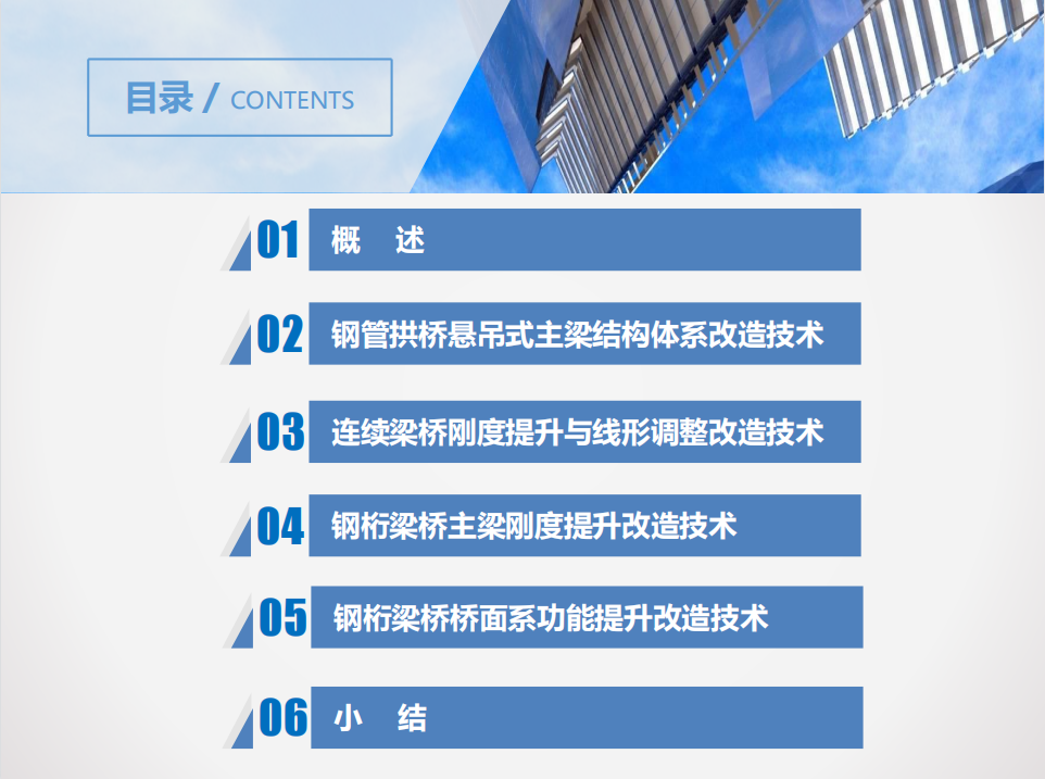 桥梁优化结构体系改造技术的主要内容是概述、钢管拱桥悬吊式主梁结构体系改造技术、连续梁桥刚度提升与线形调整改造技术、钢桁梁桥主梁刚度提升改造技术、钢桁梁桥桥面系功能提升改造技术、小结。