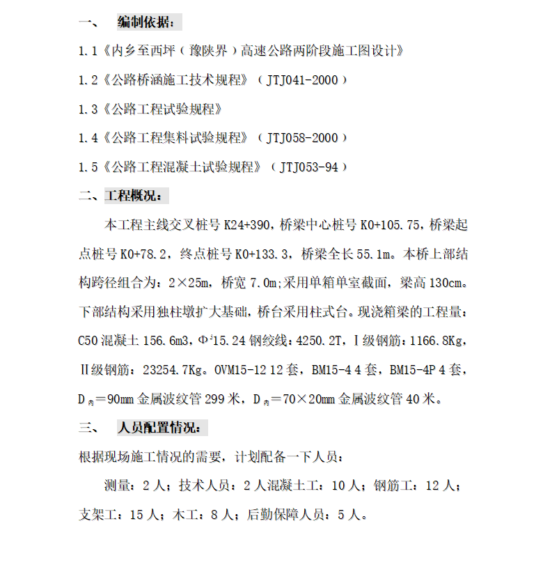 本工程主线交叉桩号K24+390,桥梁中心桩号K0+105.75,桥梁起点桩号K0+78.2,终点桩号K0+133.3,桥梁全长55.1m。本桥上部结构跨径组合为:2×25m,桥宽7.0m;采用单箱单室截面,梁高130cm。下部结构采用独柱墩扩大基础,桥台采用柱式台。现浇箱梁的工程量:C50混凝土156.6m3,Фj15.24钢绞线:4250.2T,Ⅰ级钢筋:1166.8Kg,Ⅱ级钢筋:23254.7Kg。OVM15-12 12套,BM15-4 4套,BM15-4P 4套,D内=90mm金属波纹管299米,D内=70×20mm金属波纹管40米。
