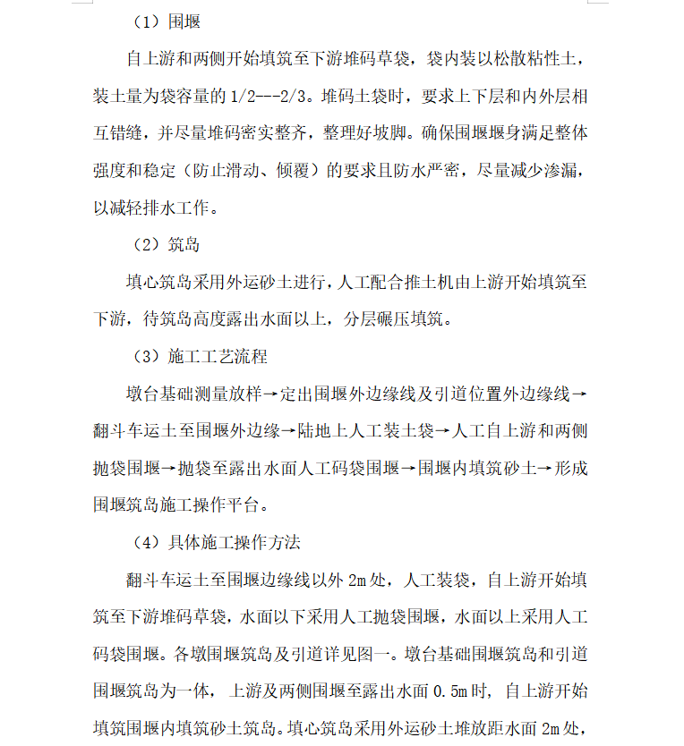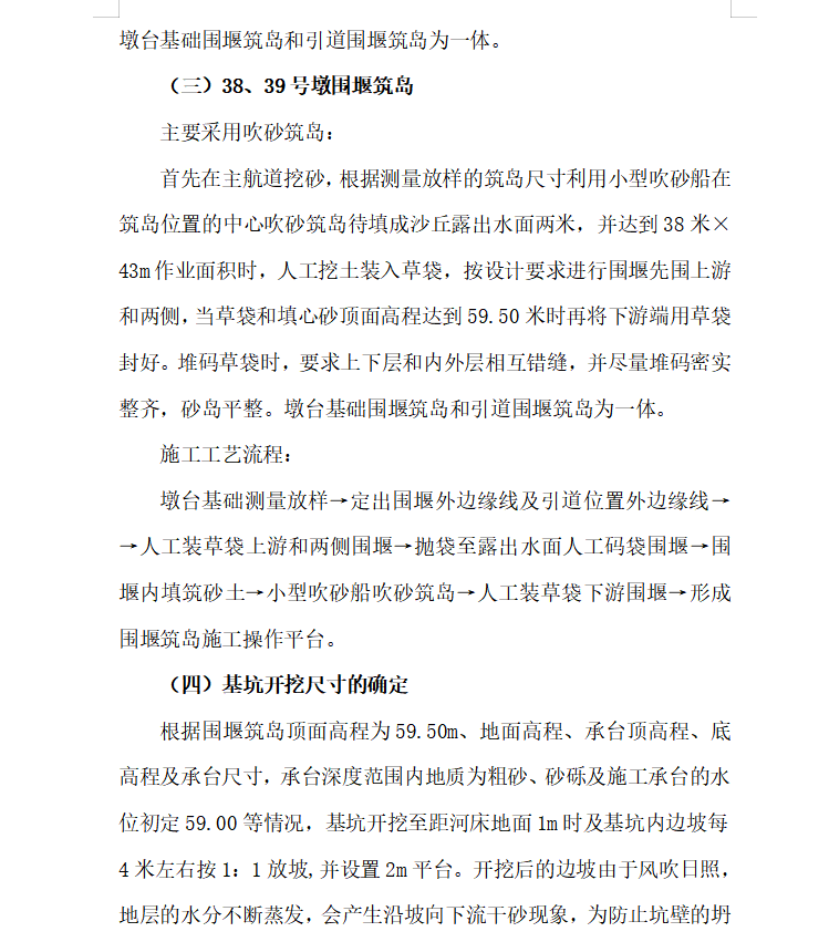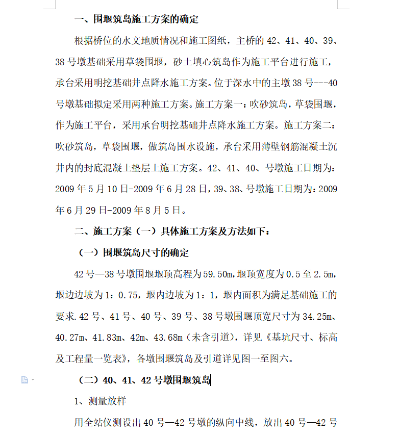 根据桥位的水文地质情况和施工图纸,主桥的42、41、40、39、38号墩基础采用草袋围堰,砂土填心筑岛作为施工平台进行施工,承台采用明挖基础井点降水施工方案。位于深水中的主墩38号---40号墩基础拟定采用两种施工方案。施工方案一:吹砂筑岛,草袋围堰,作为施工平台,采用承台明挖基础井点降水施工方案。施工方案二:吹砂筑岛,草袋围堰,做筑岛围水设施,承台采用薄壁钢筋混凝土沉井内的封底混凝土垫层上施工方案。42、41、40、号墩施工日期为:2009年5月10日-2009年6月28日,39、38、号墩施工日期为:2009年6月29日-2009年8月5日。