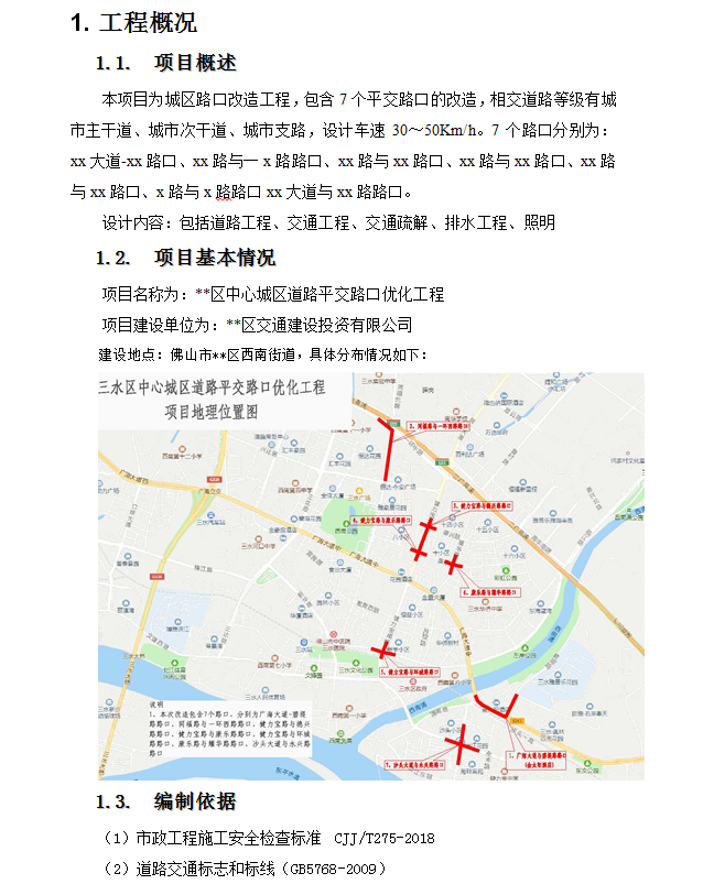 本项目为xx路口改造工程,包含7个平交路口的改造,相交道路等级有城市主干道、城市次干道、城市支路,设计车速30~50Km/h。