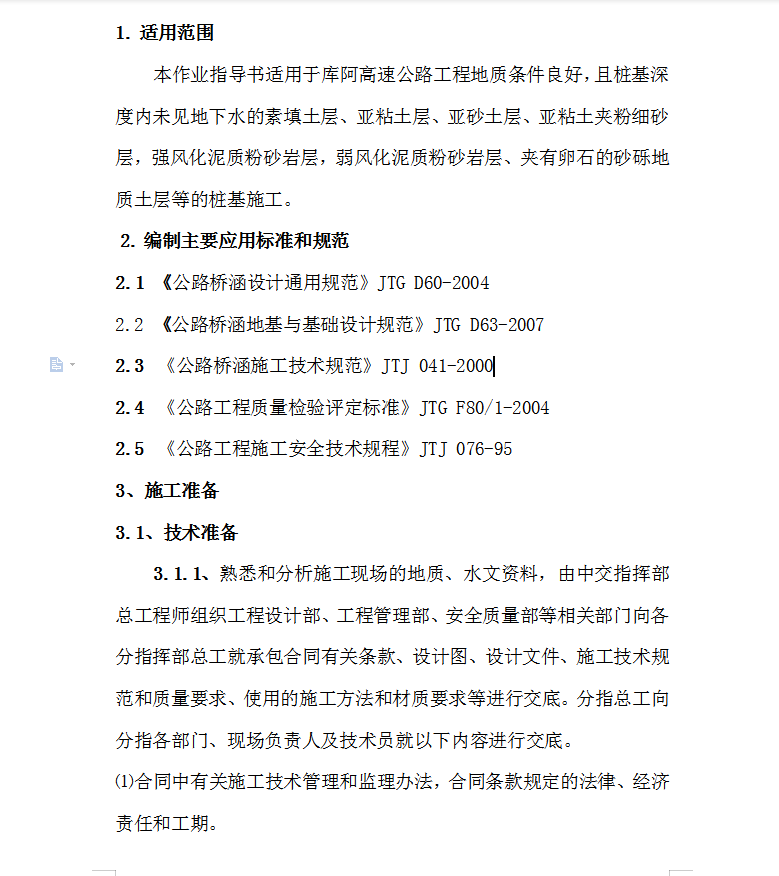 本作业指导书适用于库阿高速公路工程地质条件良好,且桩基深度内未见地下水的素填土层、亚粘土层、亚砂土层、亚粘土夹粉细砂层,强风化泥质粉砂岩层,弱风化泥质粉砂岩层、夹有卵石的砂砾地质土层等的桩基施工。