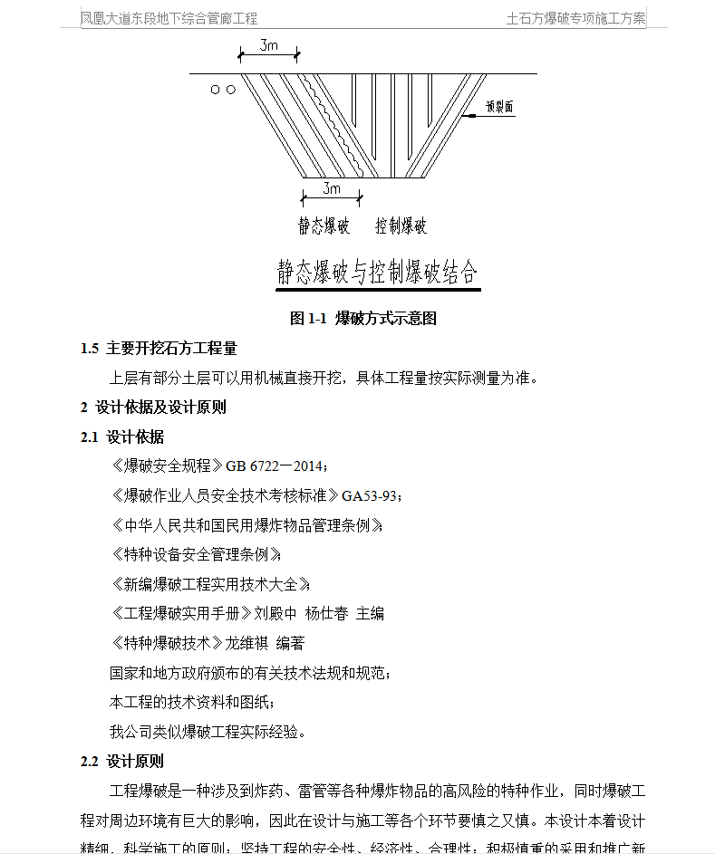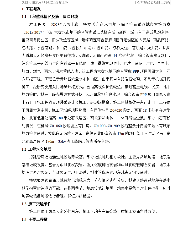 本工程位于XX省六盘水市,根据《六盘水市地下综合管廊试点城市实施方案(2015-2017年)》,六盘水市地下综合管廊试点选择在城市新区、城市主干道或景观道路、重要商务商业区、旧城改造等区域,最终确定综合管廊项目有老城区的人民路、荷泉南路、红桥路、水西南路、钟山路(西段和东段)、西山路、凉都大道、官厅路、龙井路、凤凰大道和大河经济开发区的育德路、天湖路、天湖西路等 14 条路的地下综合管廊建设项目,综合管廊平面线形与所在道路平面线形一致,最终实现供水、电力、通信、广电、再生水、热力、燃气、雨水、污水管线入廊。该工程为六盘水地下综合管廊PPP项目凤凰大道土石方开挖工程,工程位于贵州省六盘水市钟山区,由于其中公路岩石较硬,不利于机械开挖施工,经研究决定采用爆破开挖方式,因距离被保护物较近,穿过高压电线、民房、地下热力管时,拟采用静态爆破方式开挖。我公司承担六盘水地下综合管廊PPP项目凤凰大道土石方开挖工程的专项爆破设计及施工。经现场勘察,施工区域整体呈东西走向,工程位于凤凰大道东段。施工区域经现场勘察,在西侧桩号Z0+620段处,西面18米处有在建学校,北面低洼处距离180米处有民居区,南段紧邻山体,山体有滑坡迹象,部分山石有松动情况;在桩号Z0+860段边坡上有民房。Z0+000~Z0+909段沿整条开挖管廊地下有城市热力管道通过,特此段定为较为复杂。东侧有北距离管廊17m的项目部工人生活区房,东北距离居民区170m,35kv高压线跨过管廊所在道路。
