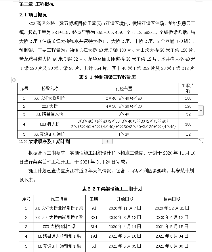 XXX高速公路土建五标项目位于重庆市江津区境内,横跨江津区油溪、龙华及慈云三镇,起点里程为k81+415,终点里程为k95+105.459,全长13.693km。