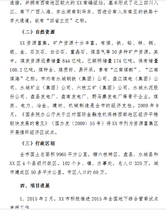 XX市试点实施的地下综合管廊共39.7公里,其中老城区管廊长度23.9公里、新城区管廊长度15.8公里,建设内容包括XX路、XX南路、XX路、XX南路、XX路(西段和东段)、XX路、XX大道、XX路、XX路、XX大道和XX经济开发区的XX路、XX路、XX西路等14条道路的地下综合管廊。
