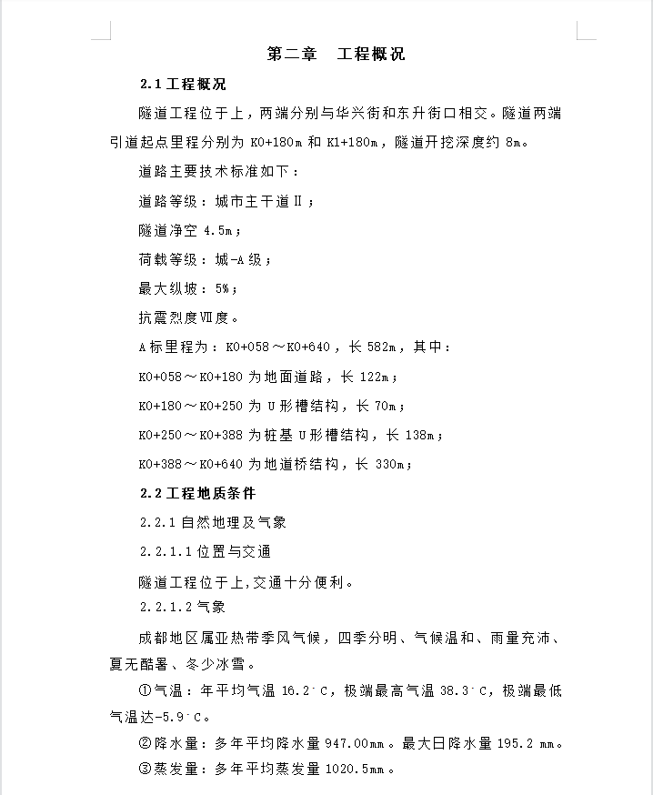 隧道工程位于上,两端分别与xx街和xx街口相交。隧道两端引道起点里程分别为K0+180m和K1+180m,隧道开挖深度约8m。路段区的地下水为埋藏于第四系砂、卵石层中的孔隙潜水。砂、卵石层为主要含水层,具有较强的渗透性。含水层厚度9.5~25.0m。大气降水及区域地下水为主要补给源。