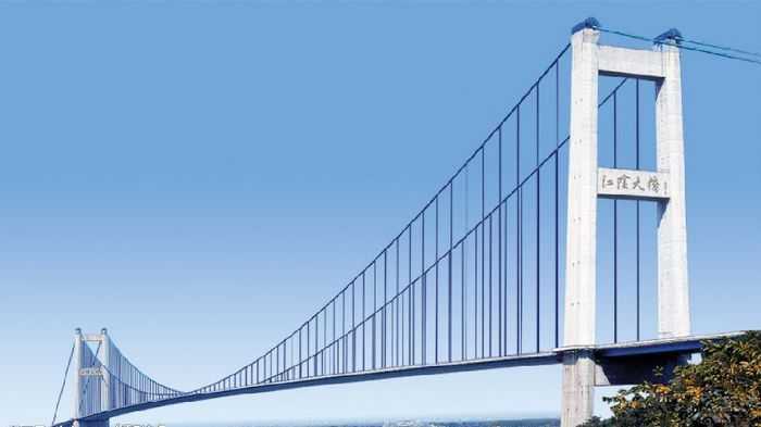 江阴长江公路大桥,位于江苏省江阴市黄田港以东3200米的西山,主跨1385米(328+1385+295),桥塔高190米,为两根钢筋混凝土空心塔柱与三道横梁组成的门式框架结构,重力式锚碇,主梁采用流线型箱梁断面,钢箱梁全宽36.9米,梁高3米,桥面宽29.5米,双向六车道,两侧各设宽1.8米的风嘴,1999年建成。