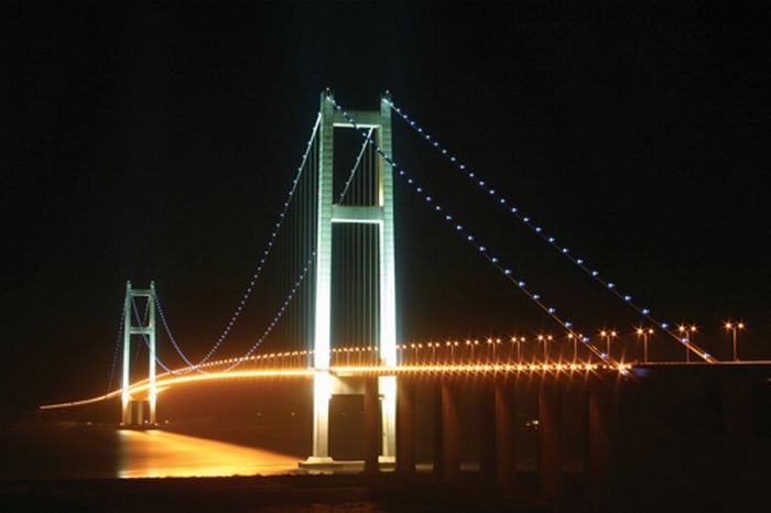 该桥主跨径1385m比江阴长江大桥长105m。大桥建设创造了多项国内第一,综合体现了目前我国公路桥梁建设的最高水平。