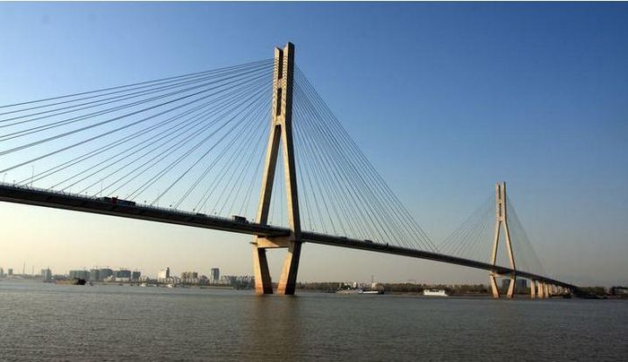 大桥主体工程由高架桥、立交桥、引桥、引道、主桥等部分组成,全长5985.66米。主桥为五跨连续双塔双索面钢箱斜拉桥梁,全长1040米。主跨长510米,列国内第七,世界第16位。主索塔呈倒“Y”形,高184米,为钢筋混凝土结构。桥面净宽26米,桥下最小通航净空24米。大桥全线按双向四车道高速公路桥梁标准建造并考虑到远景六车道的运营要求。