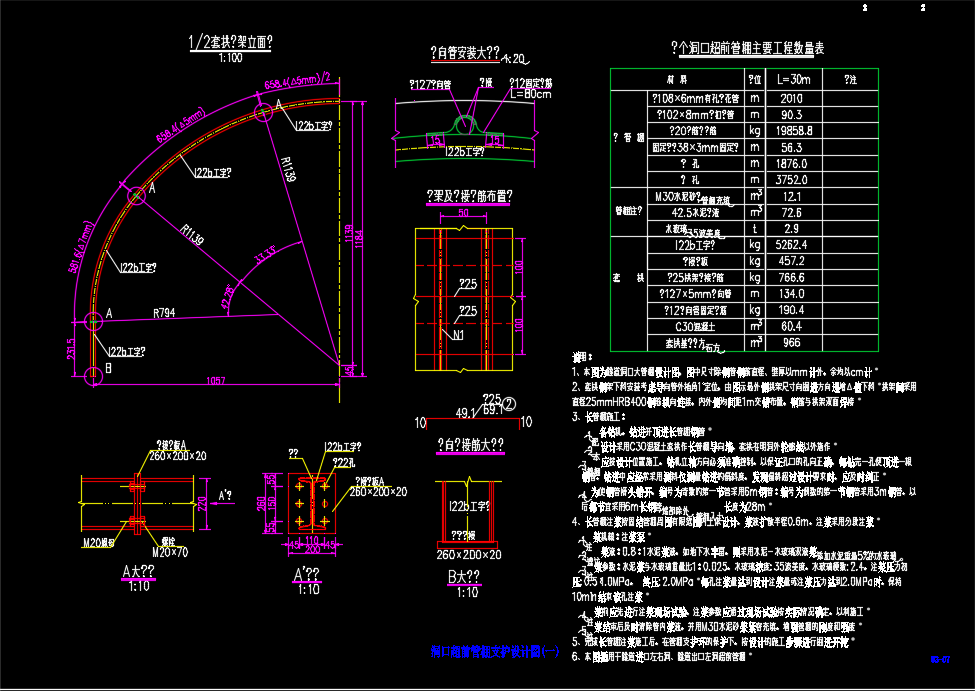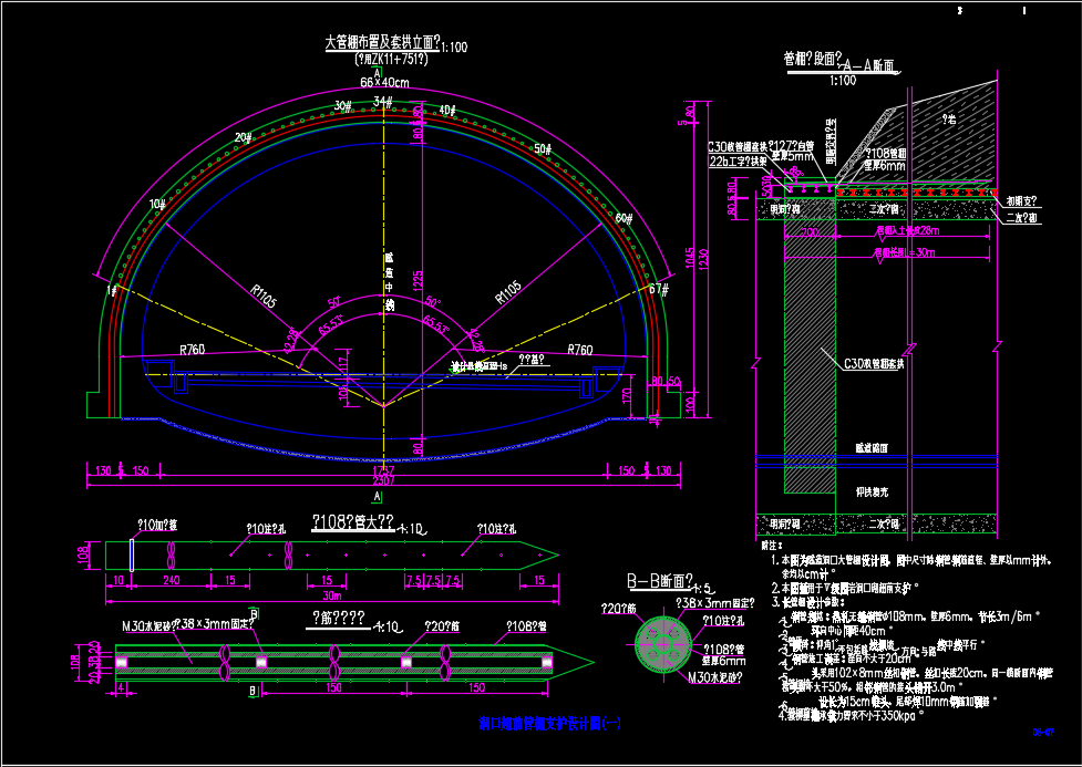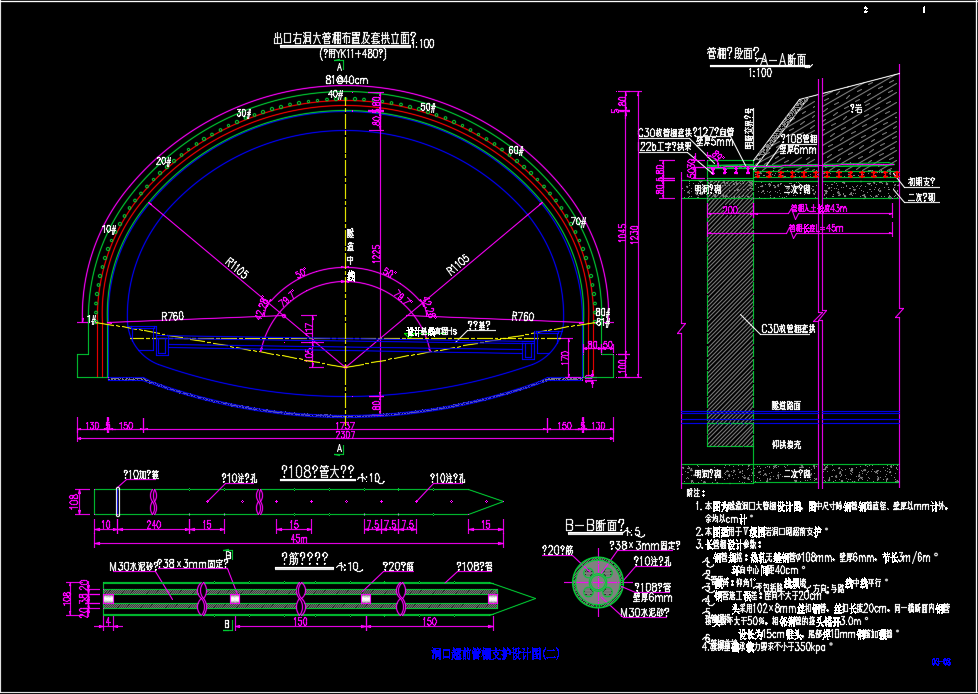 桥隧道结构含办公室及配套用房图纸包括:大管棚布置及套拱立面图、出口右洞大管棚布置及套拱立面图、1/2套拱钢架立面图、导向管安装大样图、钢架及连接钢筋布置图、纵向连接筋大样图。