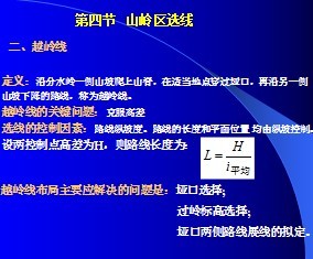 定义:沿分水岭一侧山坡爬上山脊,在适当地点穿过垭口,再沿另一侧山坡下降的路线,称为越岭线。
