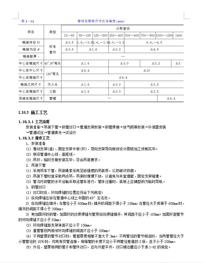 钢管对口:(1) 对口时纵、环向焊缝的位置应符合下列规定:1) 纵向焊缝应放在管道中心线上半圆的45°左右处。2) 纵向焊缝应错开,当管径小于600mm时,错开的间距不得小于100mm,当管径大于或等于600mm时,错开的间距不得小于300mm。3) 有加固环的钢管,加固环的对焊焊缝与管带纵向焊缝错开,其间距不应小于100mm;加固环距管节的环向焊缝不应小于50mm。(2) 环向焊缝距支架净距不应小于100mm。(3) 直管管段两相邻环向焊缝的间距不应小于300mm。(4) 不同壁厚的管节对口时,管壁厚度相差不宜大于3mm。不同管径的管节相连时,当两管管径大于小管管径的15%时,可用渐变管连接。渐缩管的长度不应小于两管径差值的2倍,且不小于200mm。