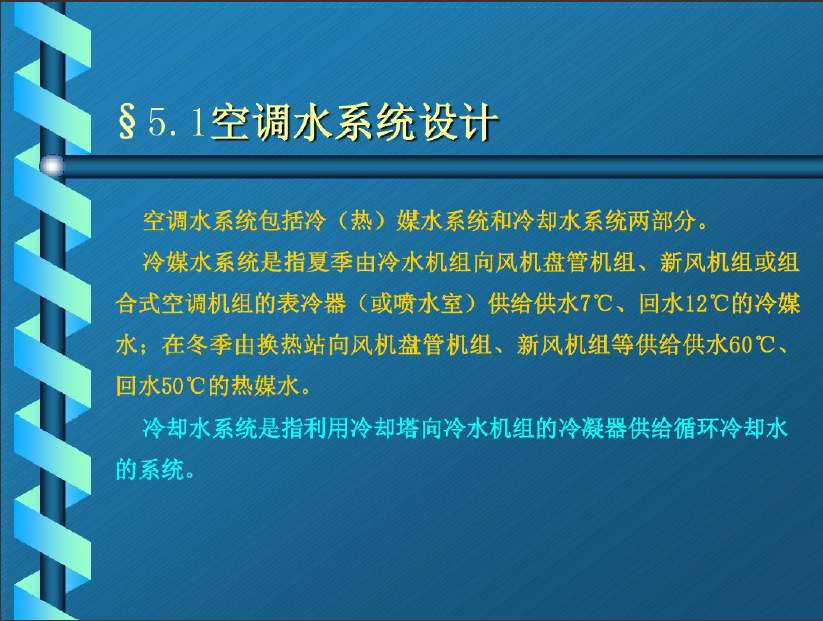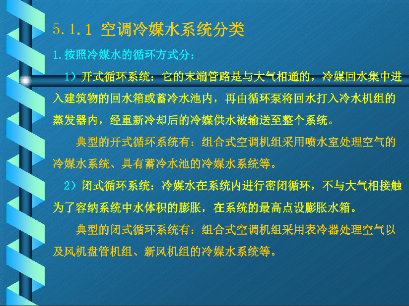 空调水系统包括冷(热)媒水系统和冷却水系统两部分。冷媒水系统是指夏季由冷水机组向风机盘管机组、新风机组或组合式空调机组的表冷器(或喷水室)供给供水7°C、回水12C的冷媒水;在冬季由换热站向风机盘管机组、新风机组等供给供水60°C、回水50C的热媒水。冷却水系统是指利用冷却塔向冷水机组的冷凝器供给循环冷却水的系统。按照冷媒水的循环方式分:1)开式循环系统:它的末端管路是与大气相通的,冷媒回水集中进入建筑物的回水箱或蓄冷水池内,再由循环泵将回水打入冷水机组的蒸发器内,经重新冷却后的冷媒供水被输送至整个系统。典型的开式循环系统有:组合式空调机组采用喷水室处理空气的冷媒水系统、具有蓄冷水池的冷媒水系统等。2)闭式循环系统:冷媒水在系统内进行密闭循环,不与大气相接触为了容纳系统中水体积的膨胀,在系统的最高点设膨胀水箱。典型的闭式循环系统有:组合式空调机组采用表冷器处理空气以及风机盘管机组、新风机组的冷媒水系统等。