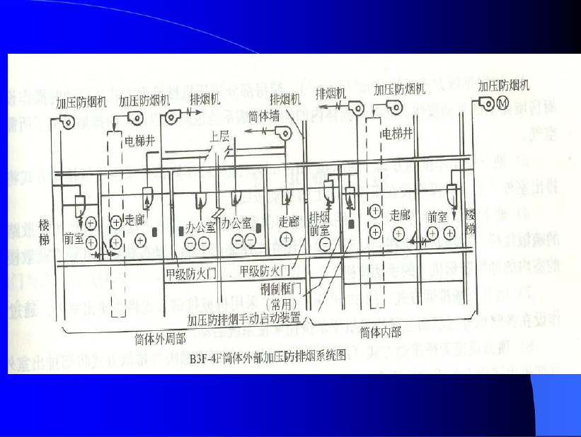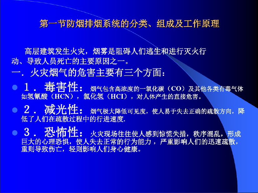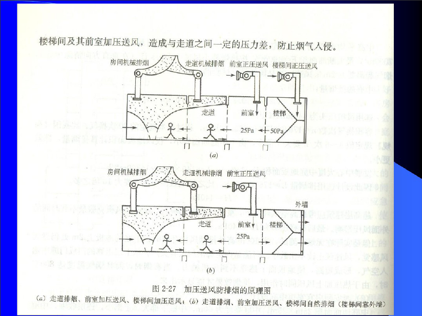 防烟、排烟设计的目的是:将火灾产生的大量烟气及时予以排除以及阻止烟气向防烟分区以外扩散,以确保建筑物内人员的顺利疏散,安全避难和为消防队员创造有利扑救条件。因此防烟、排烟是进行安全疏散的必要手段。设置自然防排烟设施,利用烟气的热浮力特性采用自然排烟和防烟。设置机械送风、机械排烟系统,对保护区域的实行正压送风防烟和机械排烟。对建筑进行防烟分隔或建立防烟封闭避难区。对建材和家具进行阻燃、消烟处理;喷洒化学消烟剂或水雾消除烟气中的有毒成分及烟尘粒子。
