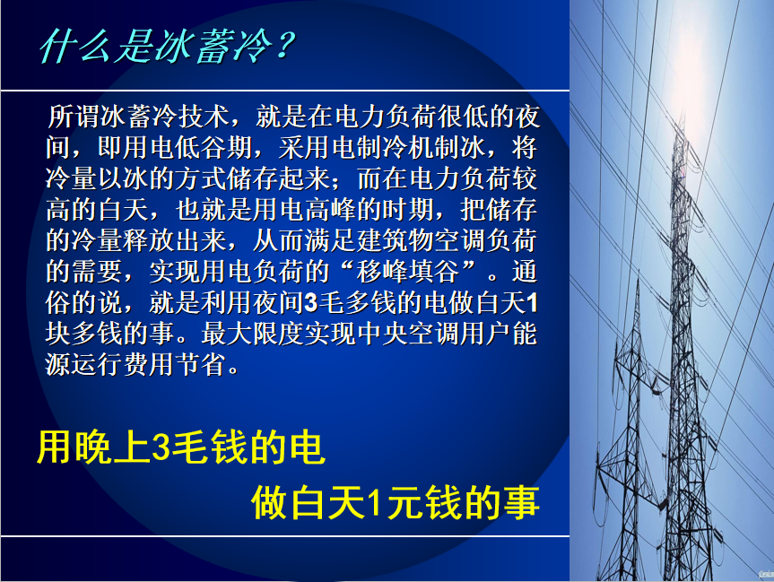 所谓冰蓄冷技术,就是在电力负荷很低的夜间,即用电低谷期,采用电制冷机制冰,将冷量以冰的方式储存起来;而在电力负荷较高的白天,也就是用电高峰的时期,把储存的冷量释放出来,从而满足建筑物空调负荷的需要,实现用电负荷的“移峰填谷”。通俗的说,就是利用夜间3毛多钱的电做白天1块多钱的事。最大限度实现中央空调用户能源运行费用节省。