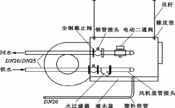 按图纸要求确定风机的规格型号及设置位置,检查安装的风机盘管表面有无破损,涡轮转动与蜗壳有无摩擦,电机有无抖动和异常噪音。