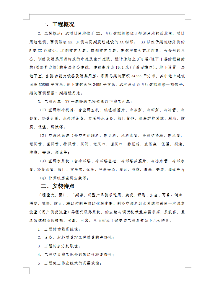本项目用地位于XX。飞行模拟机楼位于规划用地的西北角,项目用地北侧、西侧贴临XX,东侧与同期规划建设的XX相邻。 XX以位于建筑物外侧的5座XX为核心,北侧布置3座,南侧布置2座。建筑中部为南北对置、长条形的办公、训练及附属用房构成的中庭及室外庭院。设计为地上3~4层/地下1层的框架结构(局部剪力墙)的多层办公建筑,建筑高度为19.1米(至屋面檐口)。地下设置一层地下室,主要功能为设备及附属用房。项目总建筑面积34355平方米,其中地上建筑面积30860平方米,地下建筑面积3495平方米。本次设计为飞行模拟机楼一期部分,建筑西侧预留二期建设用地。