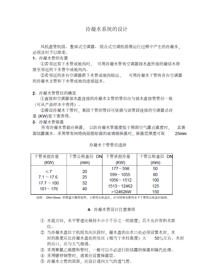 ②若邻近的多台空调器距下水管或地沟较远, 可用冷凝水干管将各台空调器的冷凝水支管和下水管或地沟连接起来。2、冷凝水管管径的确定:①直接和空调器接水盘连接的冷凝水支管的管径应与接水盘接管管径一致(可从产品样本中查得)。②需设冷凝水干管时,某段干管的管径可依据与该管段连接的空调器总冷量 (KW)按下表查得。3、冷凝水管保温:所有冷凝水管都应保温, 以防冷凝水管温度低于局部空气露点温度时, 其表面结露滴水。采用带有网络线铝箔贴面的玻璃棉保温时,保温层厚度可取25mm。