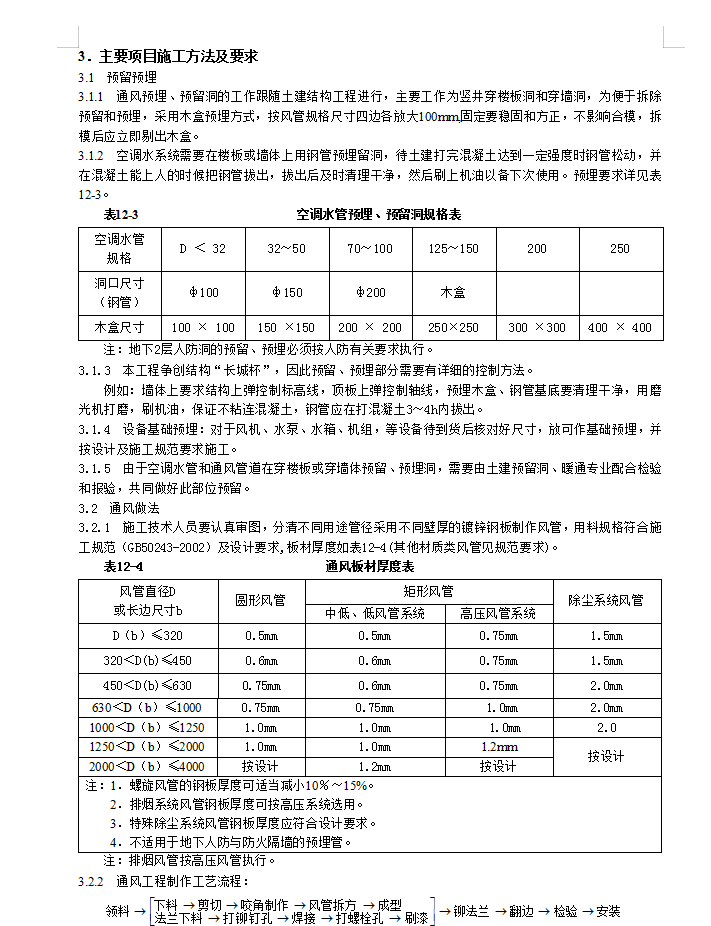 1 通风预埋、预留洞的工作跟随土建结构工程进行,主要工作为竖井穿楼板洞和穿墙洞,为便于拆除预留和预埋,采用木盒预埋方式,按风管规格尺寸四边各放大100mm,固定要稳固和方正,不影响合模,拆模后应立即剔出木盒。