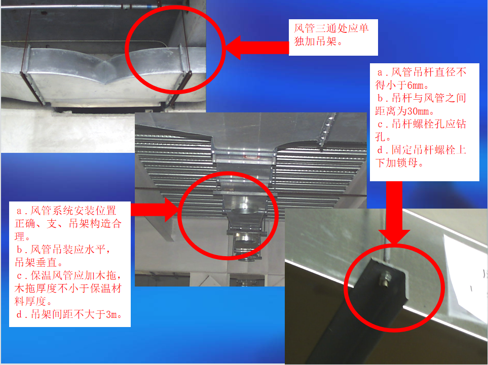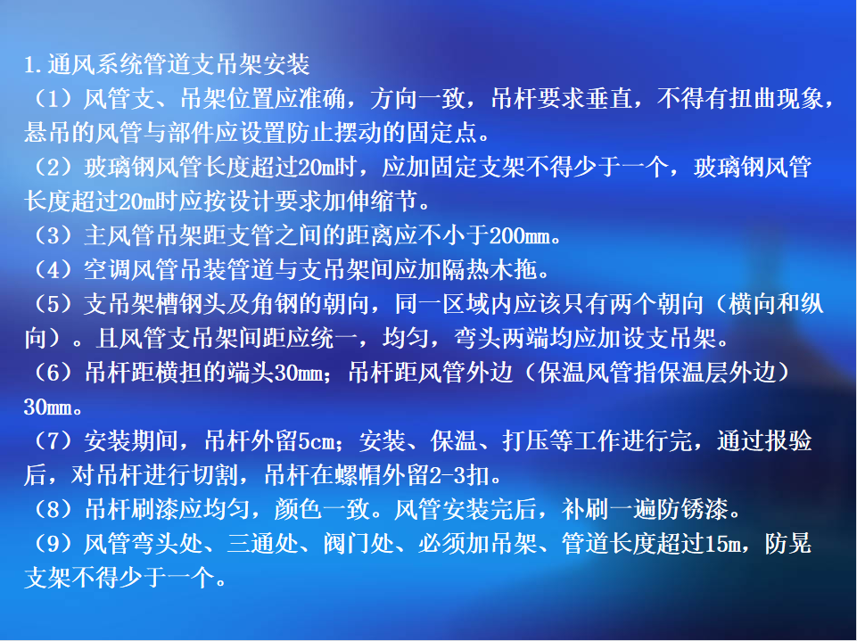通风系统管道支吊架安装:风管支、吊架位置应准确,方向一致,吊杆要求垂直,不得有扭曲现象,悬吊的风管与部件应设置防止摆动的固定点。玻璃钢风管长度超过20m时,应加固定支架不得少于一个,玻璃钢风管长度超过20m时应按设计要求加伸缩节。