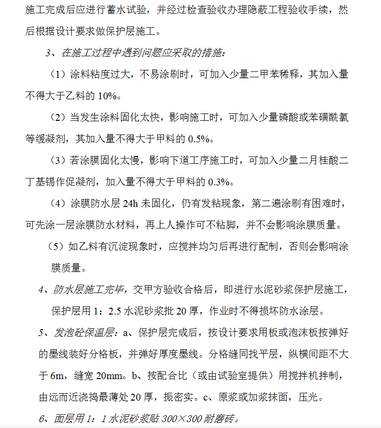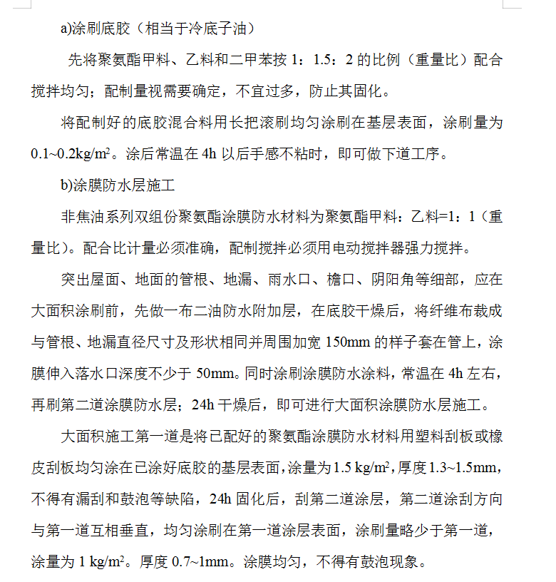 防水涂层的施工:(屋面防水涂料采用911聚胺脂涂膜,涂刷厚度为2mm)