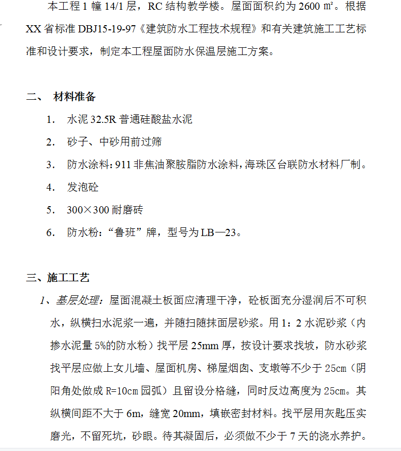 本工程1幢14/1层,RC结构教学楼。屋面面积约为2600㎡。根据XX省标准DBJ15-19-97《建筑防水工程技术规程》和有关建筑施工工艺标准和设计要求,制定本工程屋面防水保温层施工方案。