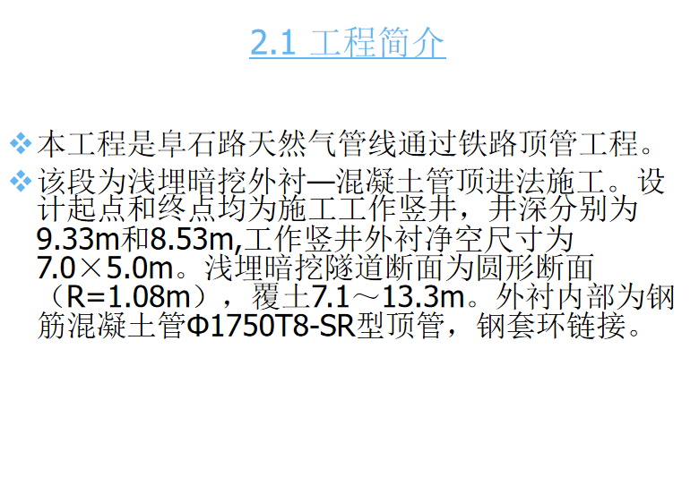 ±¾¹¤³ÌÊÇXX·ÌìÈ»Æø¹ÜÏßͨ¹ýÌú·¶¥¹Ü¹¤³Ì¡£¸Ã¶ÎΪdzÂñ°µÍÚÍâ³Ä¡ª»ìÄýÍÁ¹Ü¶¥½ø·¨Ê©¹¤¡£Éè¼ÆÆðµãºÍÖÕµã¾ùΪʩ¹¤¹¤×÷Êú¾®£¬¾®Éî·Ö±ðΪ9.33mºÍ8.53m,¹¤×÷Êú¾®Íâ³Ä¾»¿Õ³ß´çΪ7.0¡Á5.0m¡£