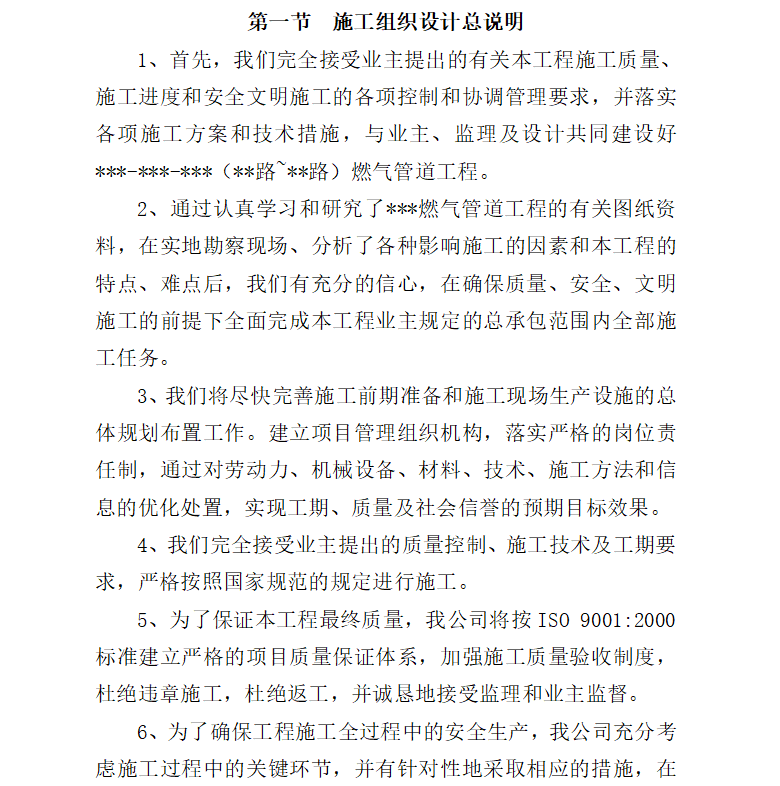 首先,我们完全接受业主提出的有关本工程施工质量、施工进度和安全文明施工的各项控制和协调管理要求,并落实各项施工方案和技术措施,与业主、监理及设计共同建设好***-***-***(**路~**路)燃气管道工程。