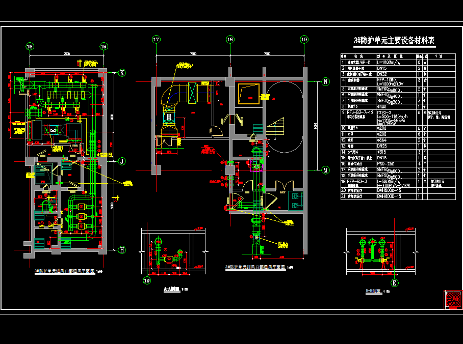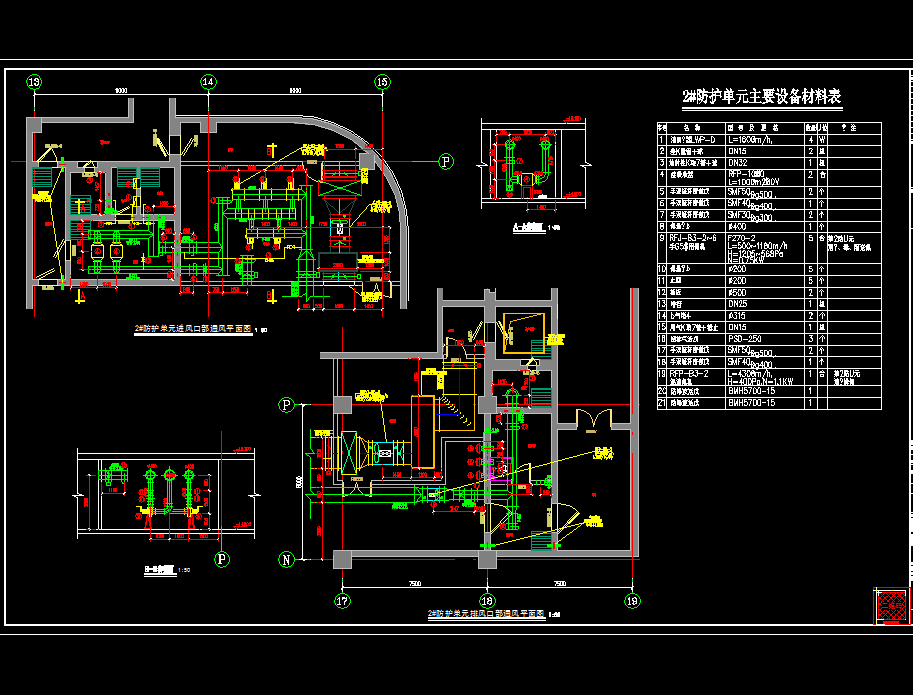 本文件为高层建筑地下室人防通风设计施工图纸,包括:1#防护单元设备表及人防机房口部详图、2#防护单元设备表及人防机房口部详图、3#防护单元设备表及人防机房口部详图、1#防护单元人防通风系统原理图、移动电站人防通风系统原理图、2#防护单元人防通风系统原理图、3#防护单元人防通风系统原理图、移动电站设备表及机房详图