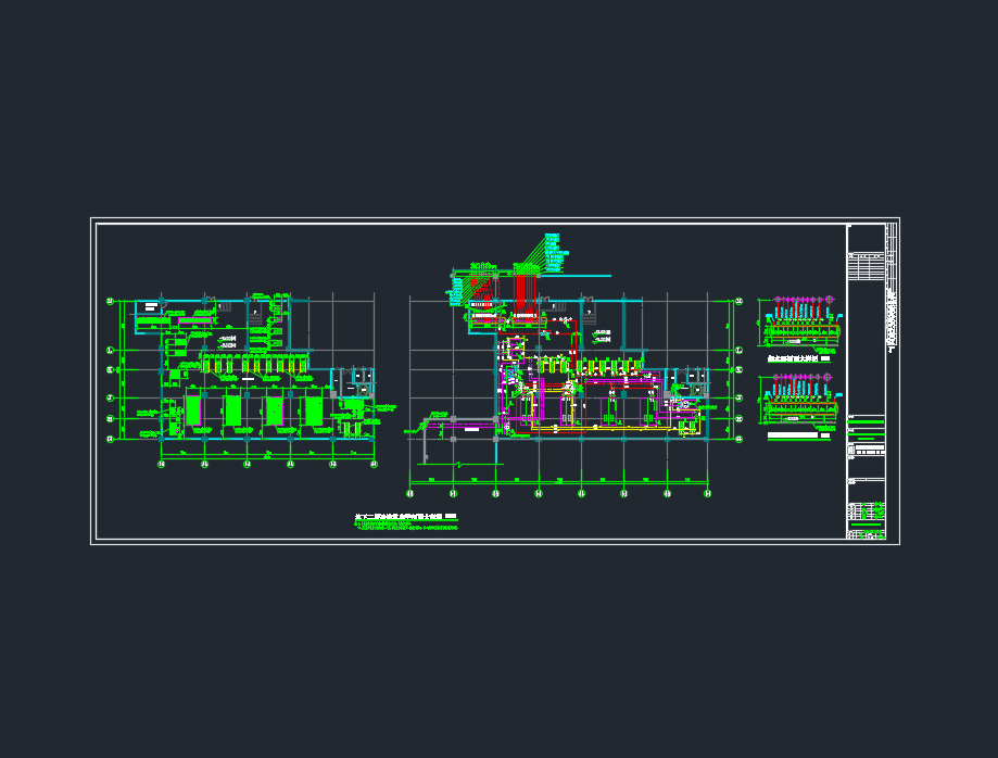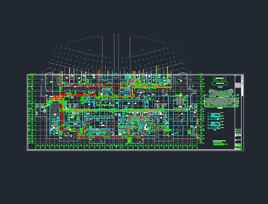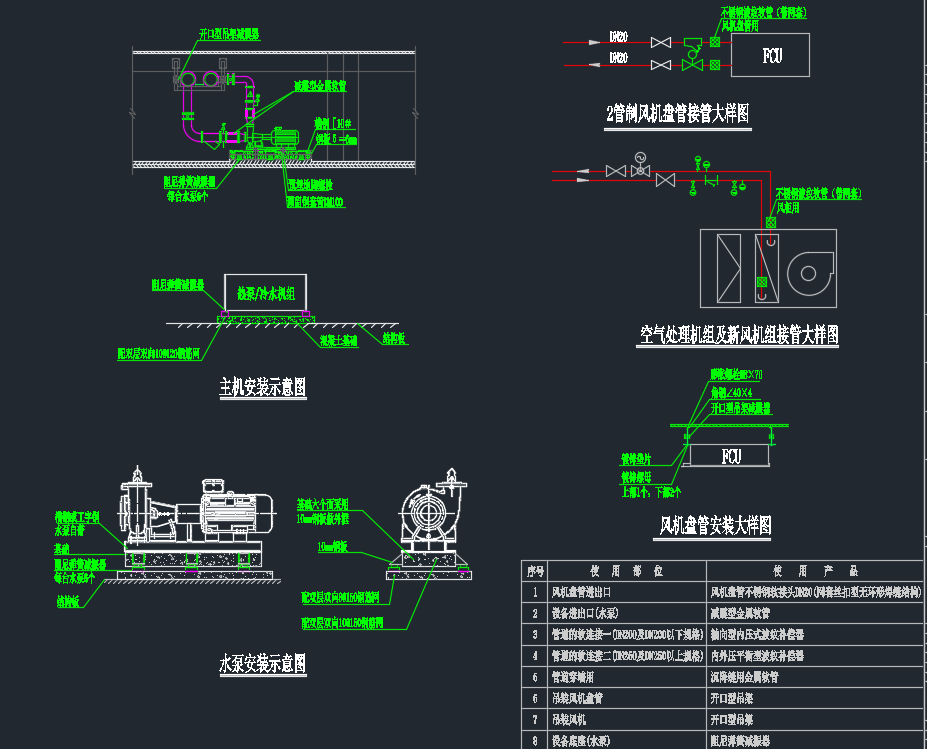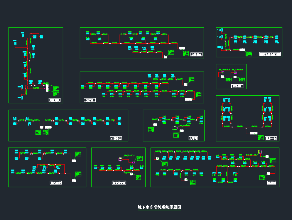 某医院医疗区地下室人防暖通施工图纸,包括:空调末端控制原理图、风机盘管、多联室内机、空调机组及排烟口接管示意图、设备及管道减震大样图、空调水系统原理图、多联机系统原理图、冷冻机房平剖面大样图、平时通风及防排烟风管平面图、空调水管平面图、中央空调计费系统原理图