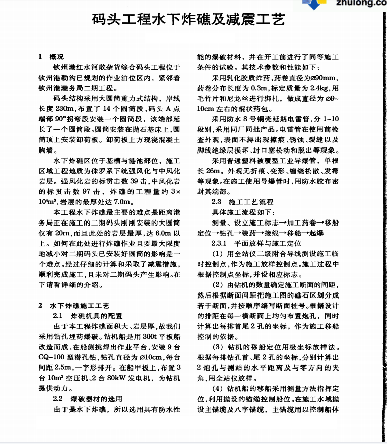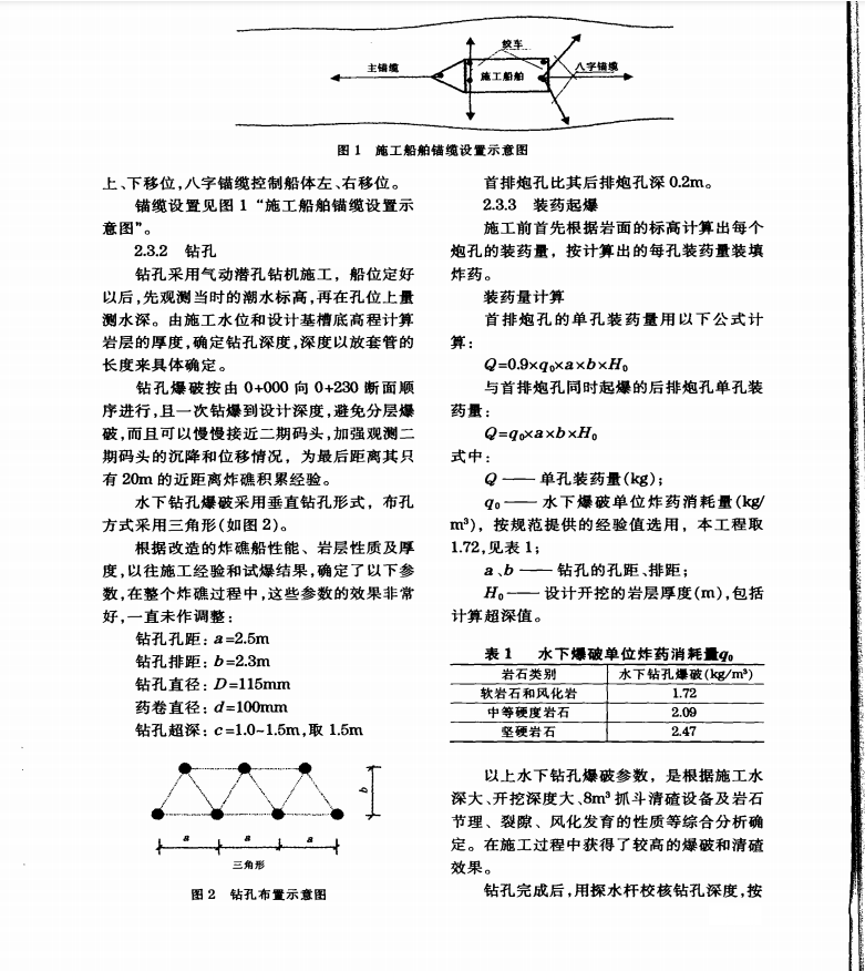 水 下 炸 礁 区位 于 基 槽 与 港 池部 位 ,施 工区域 工程 地质 为侏 罗系下统强 风化 与 中风化岩 层 。强 风 化 岩 的标 贯 击 数 39击 ,中 风 化 岩的 标 贯 击 数 97击 , 炸 礁 的 工 程 量 约 3×lO 。岩 层 的 最 厚 处 达 7.Om 。
