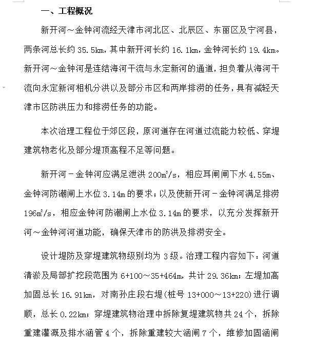 xx河~xx河流经xx市河北区、北辰区、东丽区及宁河县,两条河总长约35.5km,其中新开河长约16.1km,金钟河长约19.4km。新开河~金钟河是连结海河干流与永定新河的通道,担负着从海河干流向永定新河相机分洪以及部分市区和两岸排涝的任务,具有减轻天津市区防洪压力和排涝任务的功能。