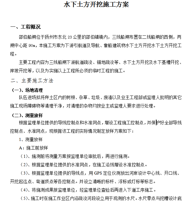 主要工程内容为三线船闸下游航道疏浚、锚地疏浚等、水下土方开挖及水下基槽开挖、岸坡开挖等,以及为实施以上工程所必须的临时工程的施工。