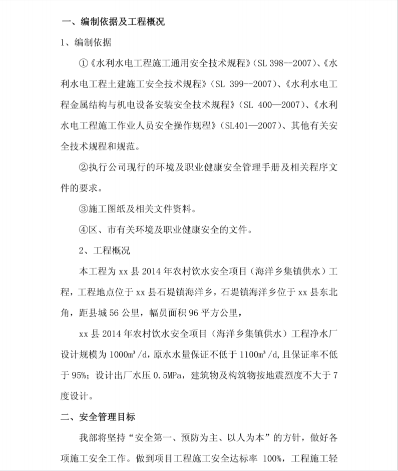 ±¾¹¤³ÌΪxxÏØ2014ÄêÅ©´åÒûË®°²È«ÏîÄ¿(º£ÑóÏ缯Õò¹©Ë®)¹¤³Ì£¬¹¤³ÌµØµãλÓÚxxÏØxxÕòxxÏ磬xxÕòxxÏçλÓÚxxÏØ¶«±±½Ç£¬¾àÏØ³Ç56¹«À·ùÔ±Ãæ»ý96ƽ·½¹«ÀxxÏØ2014ÄêÅ©´åÒûË®°²È«ÏîÄ¿(xxÏ缯Õò¹©Ë®)¹¤³Ì¾»Ë®³§Éè¼Æ¹æÄ£Îª1000m3 /d,ԭˮˮÁ¿±£Ö¤²»µÍÓÚ1100m3 /d,ÇÒ±£Ö¤Âʲ»µÍÓÚ95%;Éè¼Æ³ö³§Ë®Ñ¹0.5MPa£¬½¨ÖþÎï¼°¹¹ÖþÎï°´µØÕðÁҶȲ»´óÓÚ7¶ÈÉè¼Æ¡£