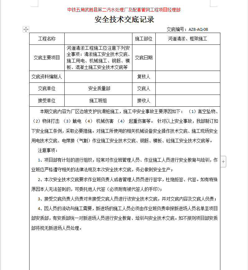 ºÓµÀÇåÓÙ¡¢¿ò¼ÜÊ©¹¤°²È«¼¼Êõ½»µ×¼Ç¼ 18P