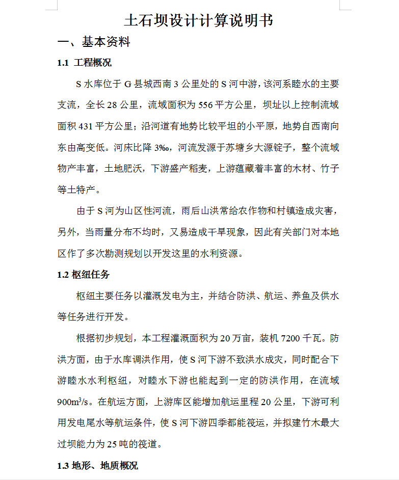 S水库位于G县城西南3公里处的S河中游,该河系睦水的主要支流,全长28公里,流域面积为556平方公里,坝址以上控制流域面积431平方公里;沿河道有地势比较平坦的小平原,地势自西南向东由高变低。河床比降3‰,河流发源于苏塘乡大源锭子,整个流域物产丰富,土地肥沃,下游盛产稻麦,上游蕴藏着丰富的木材、竹子等土特产。