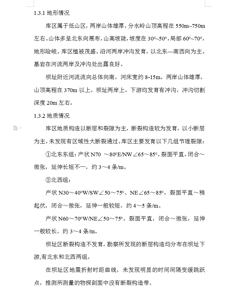 库区属于低山区,两岸山体雄厚,分水岭山顶高程在550m~750m左右。山体多呈北东向展布,山高坡陡,坡度在30°~50°,局部60°~70°,地形险峻。库区植被茂盛。沿河两岸冲沟发育,以北东—南西向为主。基岩在河流两岸及冲沟处出露良好。