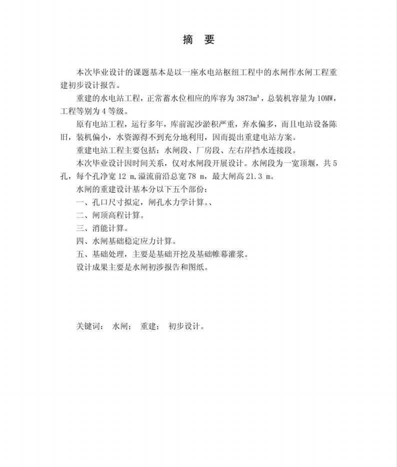 本次毕业设计的课题基本是以一座水电站枢纽工程中的水闸作水闸工程重建初步设计报告。重建的水电站工程,正常蓄水位相应的库容为3873m3 ,总装机容量为10MW,工程等别为4等级。原有电站工程,运行多年,库前泥沙淤积严重,弃水偏多,而且电站设备陈旧,装机偏小,水资源得不到充分地利用,因而提出重建电站方案。