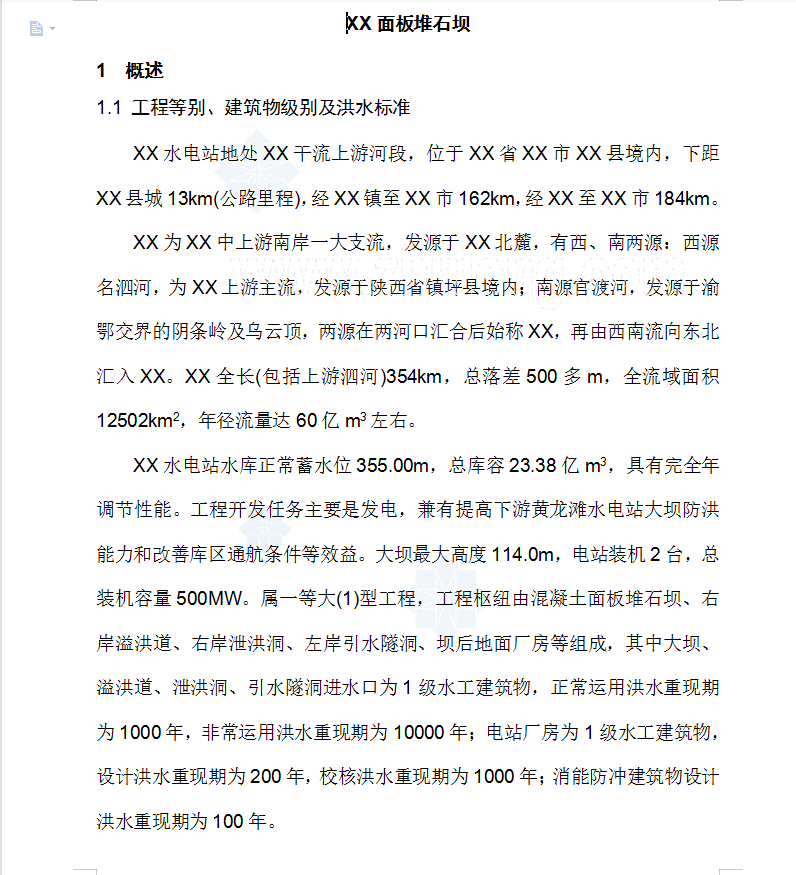 属一等大(1)型工程,工程枢纽由混凝土面板堆石坝、右岸溢洪道、右岸泄洪洞、左岸引水隧洞、坝后地面厂房等组成,其中大坝、溢洪道、泄洪洞、引水隧洞进水口为1级水工建筑物,正常运用洪水重现期为1000年,非常运用洪水重现期为10000年;电站厂房为1级水工建筑物,设计洪水重现期为200年,校核洪水重现期为1000年;消能防冲建筑物设计洪水重现期为100年。