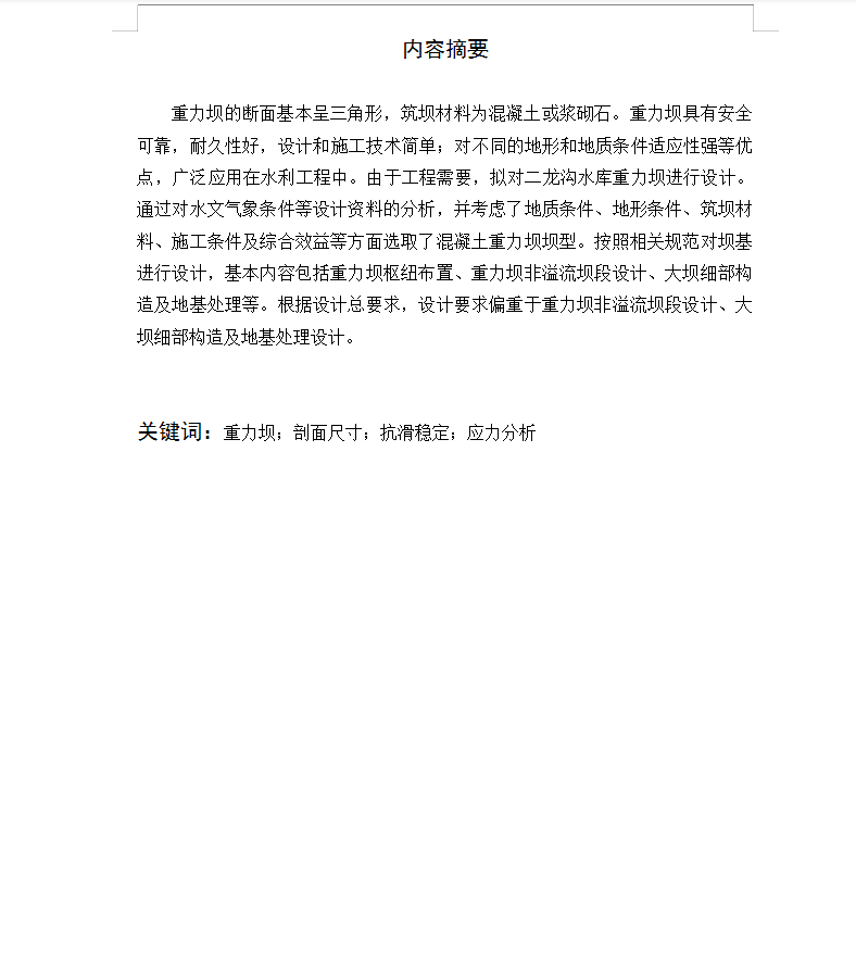重力坝的断面基本呈三角形,筑坝材料为混凝土或浆砌石。重力坝具有安全可靠,耐久性好,设计和施工技术简单;对不同的地形和地质条件适应性强等优点,广泛应用在水利工程中。由于工程需要,拟对二龙沟水库重力坝进行设计。通过对水文气象条件等设计资料的分析,并考虑了地质条件、地形条件、筑坝材料、施工条件及综合效益等方面选取了混凝土重力坝坝型。按照相关规范对坝基进行设计,基本内容包括重力坝枢纽布置、重力坝非溢流坝段设计、大坝细部构造及地基处理等。根据设计总要求,设计要求偏重于重力坝非溢流坝段设计、大坝细部构造及地基处理设计。