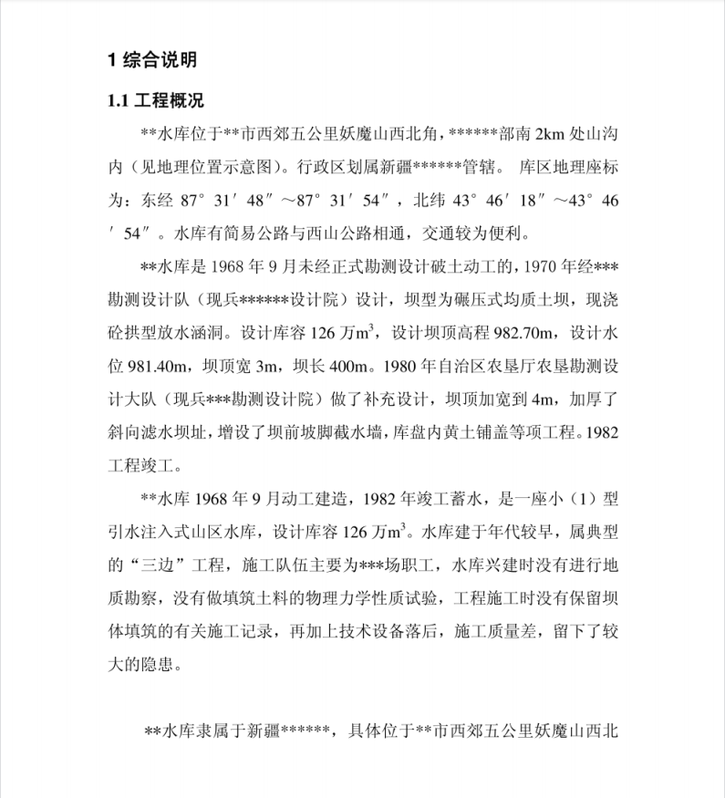 **水库1968年9月动工建造,1982 年竣工蓄水,是一座小(1)型引水注入式山区水库,设计库容126万m’。水库建于年代较早,属典型的“三边”工程,施工队伍主要为***场职工,水库兴建时没有进行地质勘察,没有做填筑土料的物理力学性质试验,工程施工时没有保留坝体填筑的有关施工记录,再加上技术设备落后,施工质量差,留下了较大的隐患。