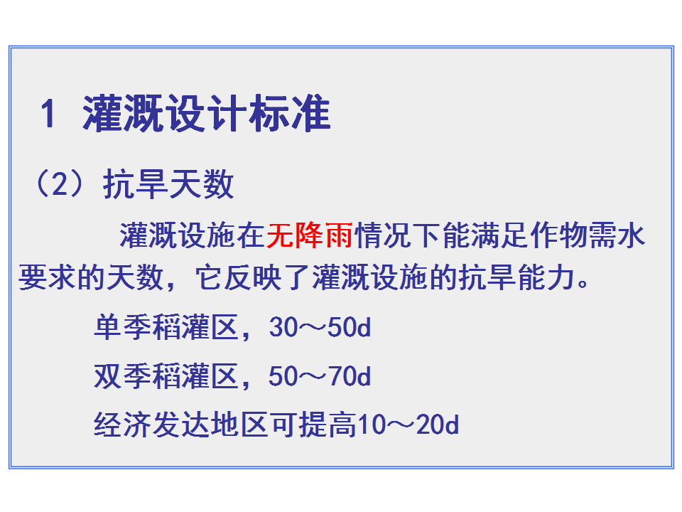 灌溉设施在无降雨情况下能满足作物需水要求的天数,它反映了灌溉设施的抗旱能力。