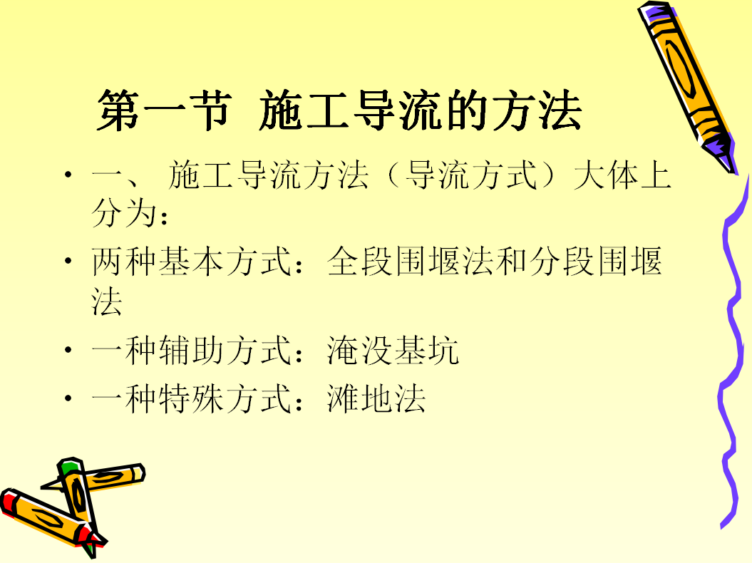 3、根据不同时期泄水道的特点:分期导流方式包括:束窄河床导流和通过已完建或未完建的永久建筑物导流(底孔、缺口)梳齿孔、厂房。