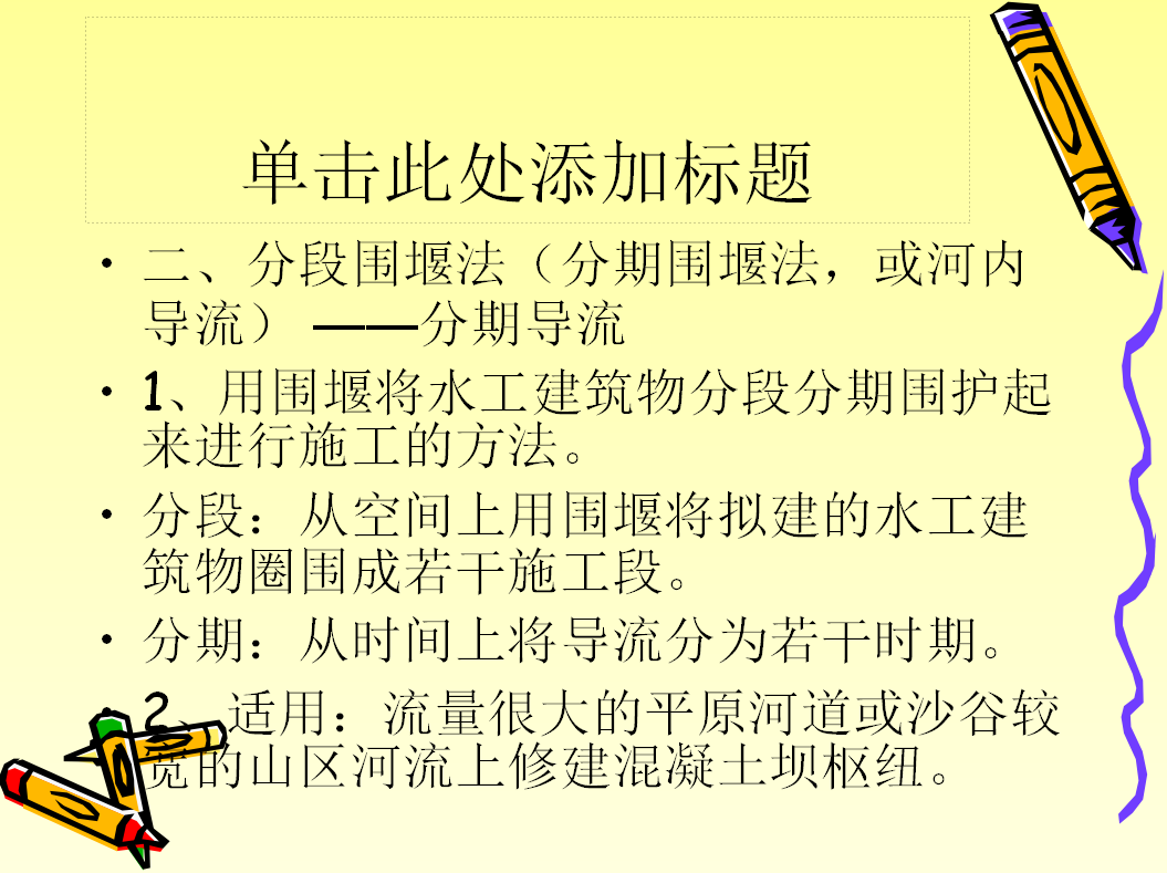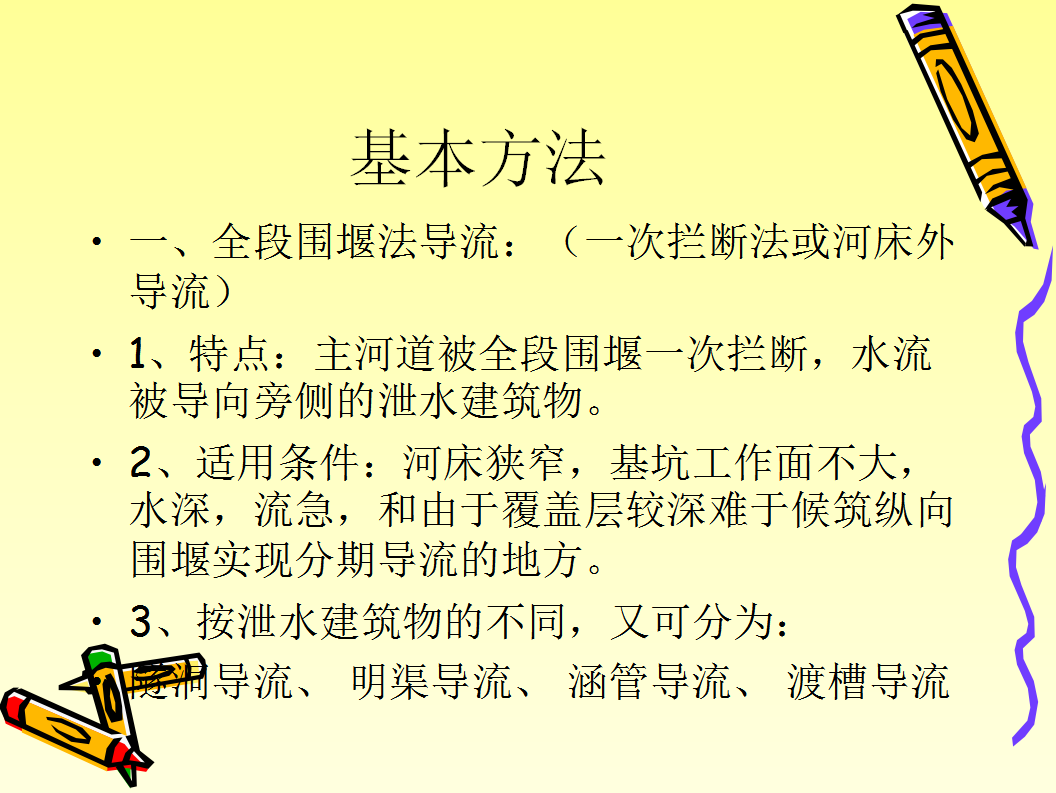 2、适用条件:河床狭窄,基坑工作面不大,水深,流急,和由于覆盖层较深难于候筑纵向围堰实现分期导流的地方。