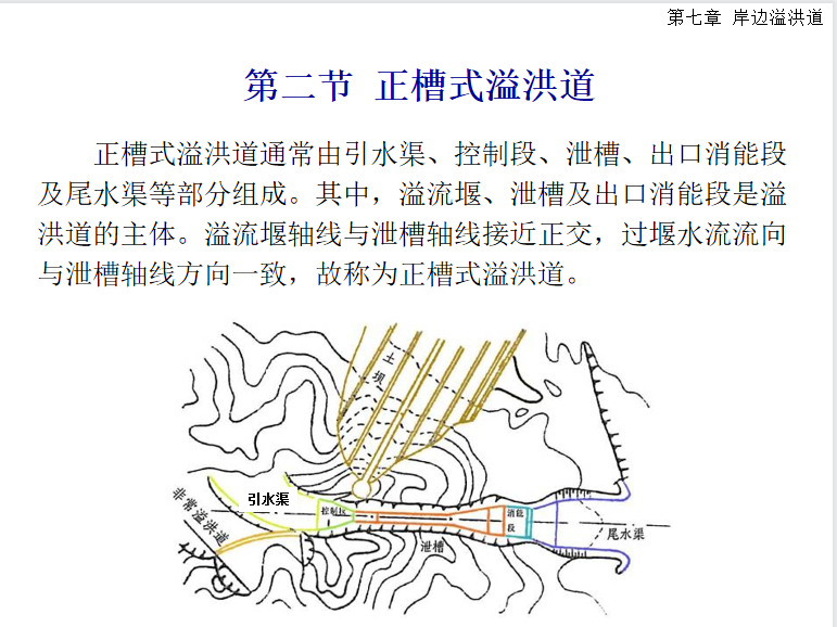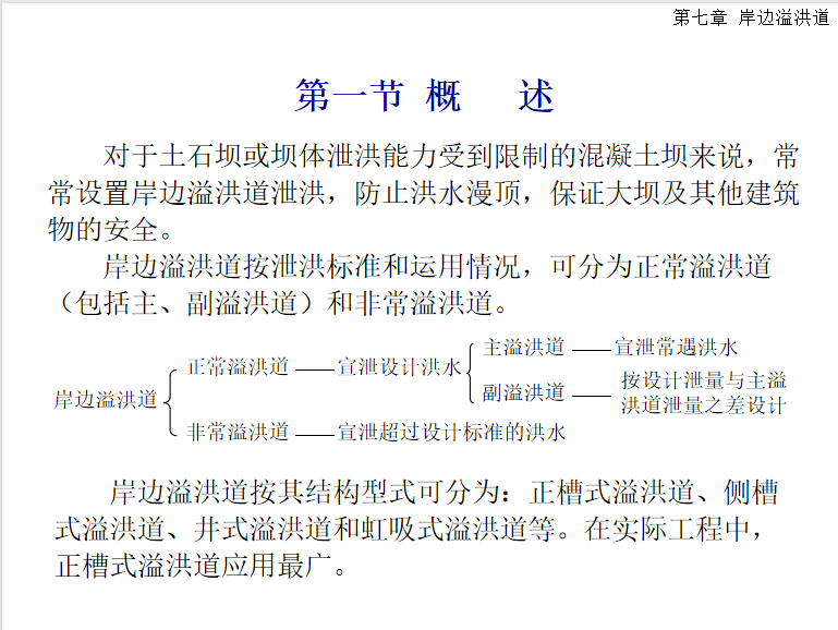 岸边溢洪道主要说明概述、 正槽式溢洪道、其他型式的溢洪道、非常泄洪设施、岸边溢洪道的布置和型式选择
