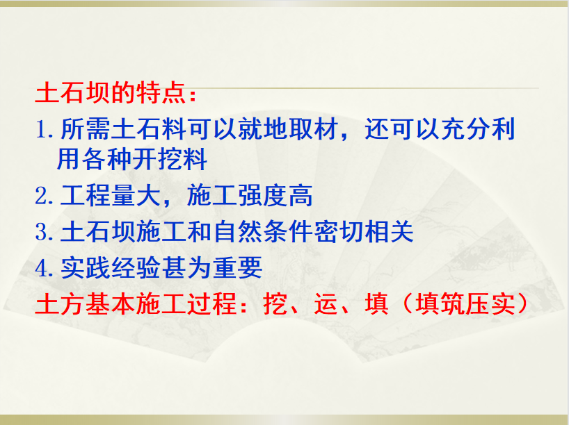 水利水电工程中,土方工程应用非常广泛。有些水工建筑物,如土坝、土堤、土渠等,几乎全部都是土方工程。土石坝:包括各种碾压式土坝、堆石坝和土石混合坝 。土石坝最大的特点是对材料的适应性,能够根据近坝材料的特性,设计坝体断面,因此,土石坝又被称 作当地材料坝。