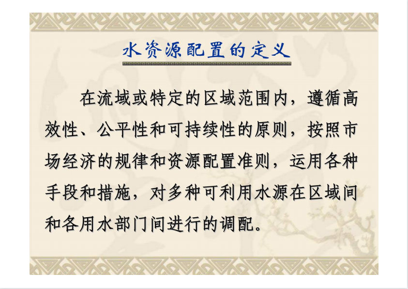 在流域或特定的区域范围内,遵循高效性、公平性和可持续性的原则,按照市场经济的规律和资源配置准则,运用各种手段和措施,对多种可利用水源在区域间和各用水部门间进行的调配。