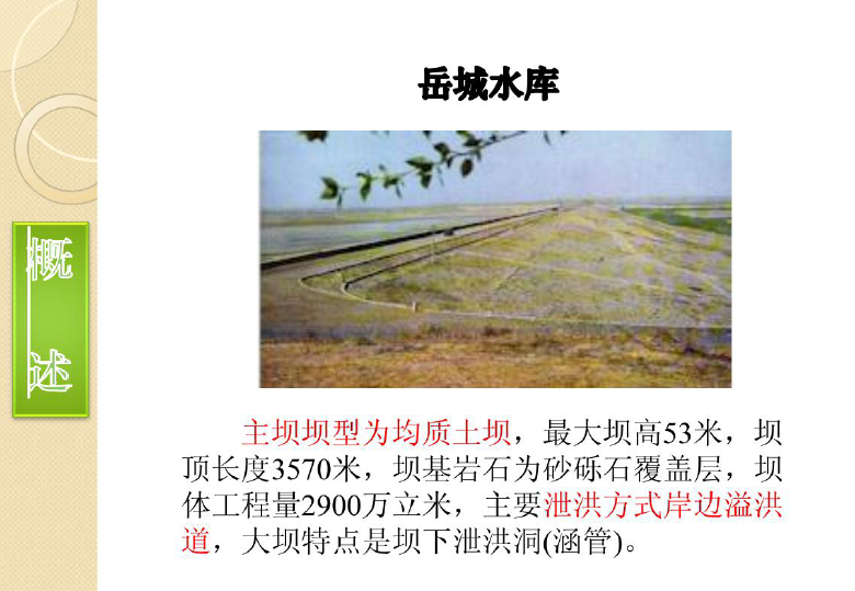 利用当地土石材料填筑而成的挡水坝,又称当地材料坝。历史悠久,发展很快,国内、外广泛采用。主坝坝型为均质土坝,最大坝高53米,坝顶长度3570米,坝基岩石为砂砾石覆盖层,坝体工程量2900万立米,主要泄洪方式岸边溢洪道,大坝特点是坝下泄洪洞(涵管)。