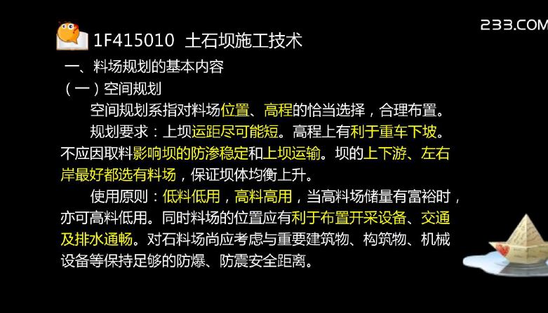 土石坝是一种充分利用当地材料的坝型。从空间规划系指对料场位置、高程的恰当选择,合理布置。规划要求:上坝运距尽可能短。高程上有利于重车下坡。不应因取料影响坝的防渗稳定和上坝运输。坝的上下游、左右岸最好都选有料场,保证坝体均衡上升。使用原则:低料低用,高料高用,当高料场储量有富裕时亦可高料低用。同时料场的位置应有利于布置开采设备、交通及排水通畅。对石料场尚应考虑与重要建筑物、构筑物、机械设备等保持足够的防爆、防震安全距离。空间、时间、质与量方面进行全面规划。