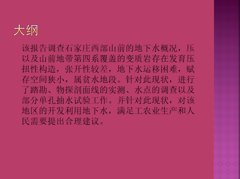 该报告调查xxx西部山前的地下水概况,压以及山前地带第四系覆盖的变质岩存在发育压扭性构造,张开性较差,地下水运移困难,赋存空间狭小,属贫水地段。