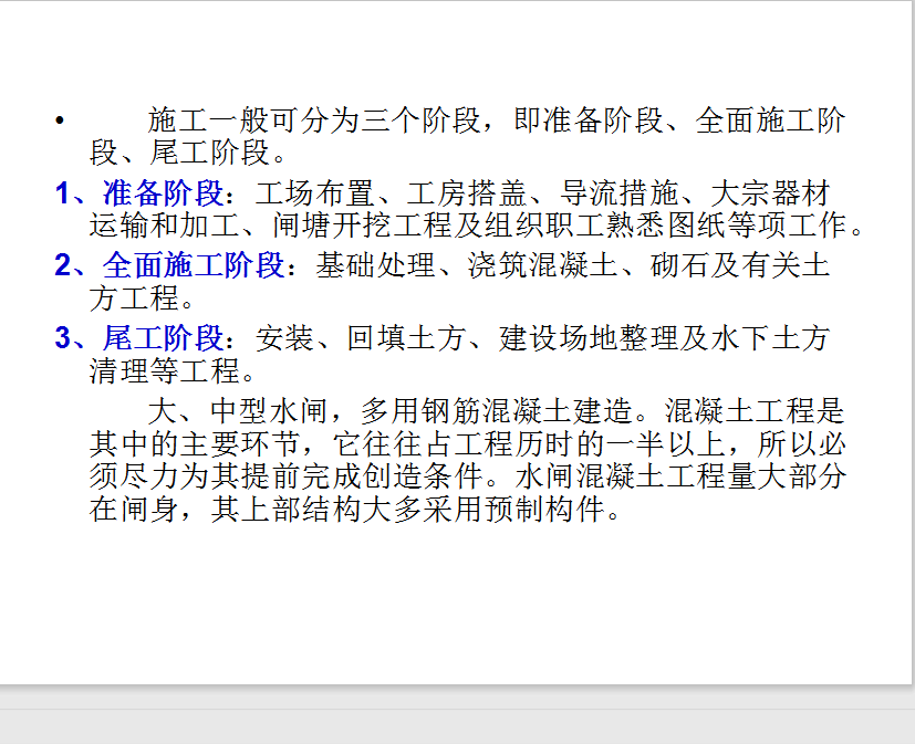 大、中型水闸,多用钢筋混凝土建造。混凝土工程是其中的主要环节,它往往占工程历时的一半以上,所以必须尽力为其提前完成创造条件。水闸混凝土工程量大部分在闸身,其上部结构大多采用预制构件。